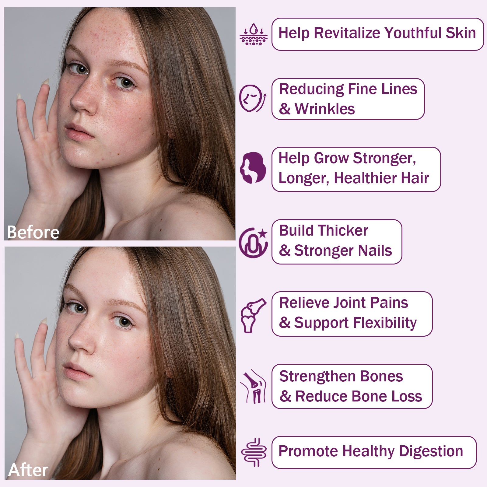• Nourishes Hair, Skin, Nails, and Joints: Provides essential nutrients for overall health and well-being.