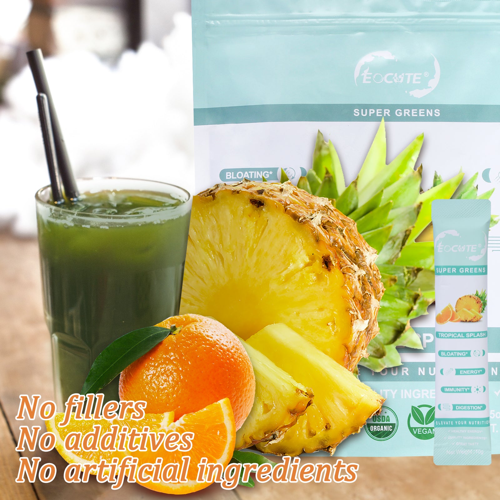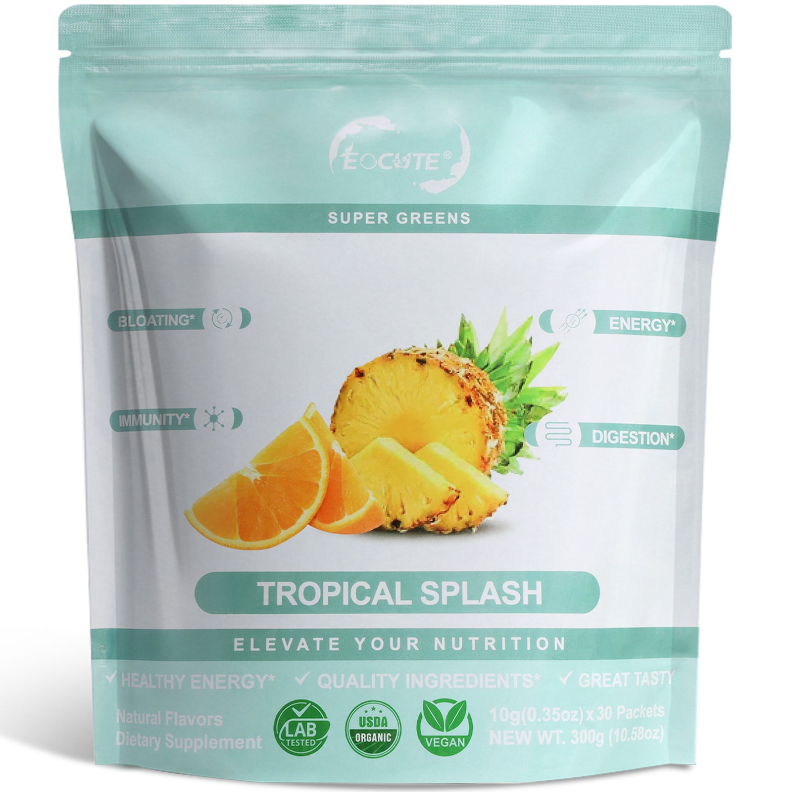 EOCUTE Super Greens – Organic Greens Powder to Reduce Bloat, Support Gut Health, Boost Immunity, Healthy Digestion for Women – Antioxidant Support – Spirulina – Chlorella – Tropical Splash-30 packets